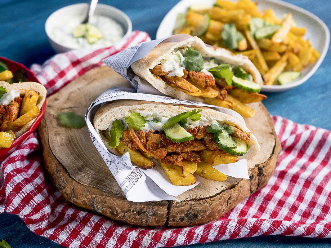Разрежьте тепловую пита пополам. В кармашек уложите мясо, немного картофеля, огурец и йогуртовую заправку. Повторите для оставшихся ингредиентов. Гирос готов к подаче сразу.