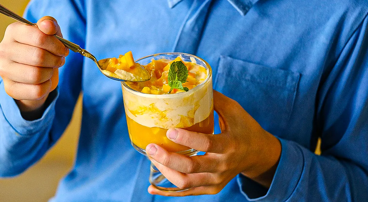 Ключ к эффектной подаче — прозрачные бокалы и маленькие акценты: свежая мята, кусочки манго или ягоды. Добавка ванильного аромата в мусс подчеркивает фруктовую ноту и делает десерт более выразительным, оставаясь при этом легким.