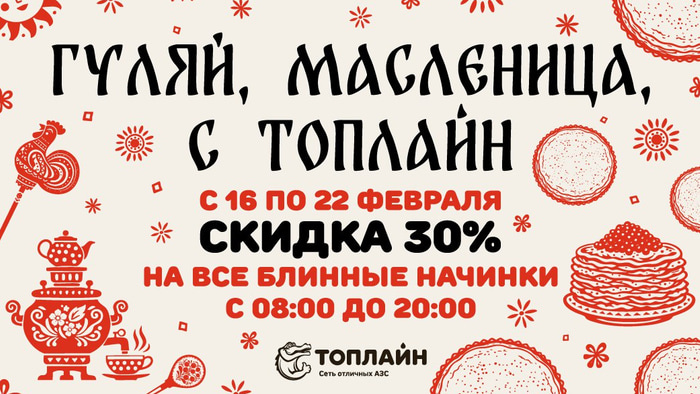 Сеть автозаправочных станций «Топлайн» объявила о запуске праздничной акции в честь Масленицы. С 16 по 22 февраля всех клиентов ожидает приятный сюрприз — 30% скидка на блинные начинки. Это предложение доступно ежедневно с 8:00 до 20:00 на всех АЗС, которые оборудованы блинными точками «Люклер Авто».