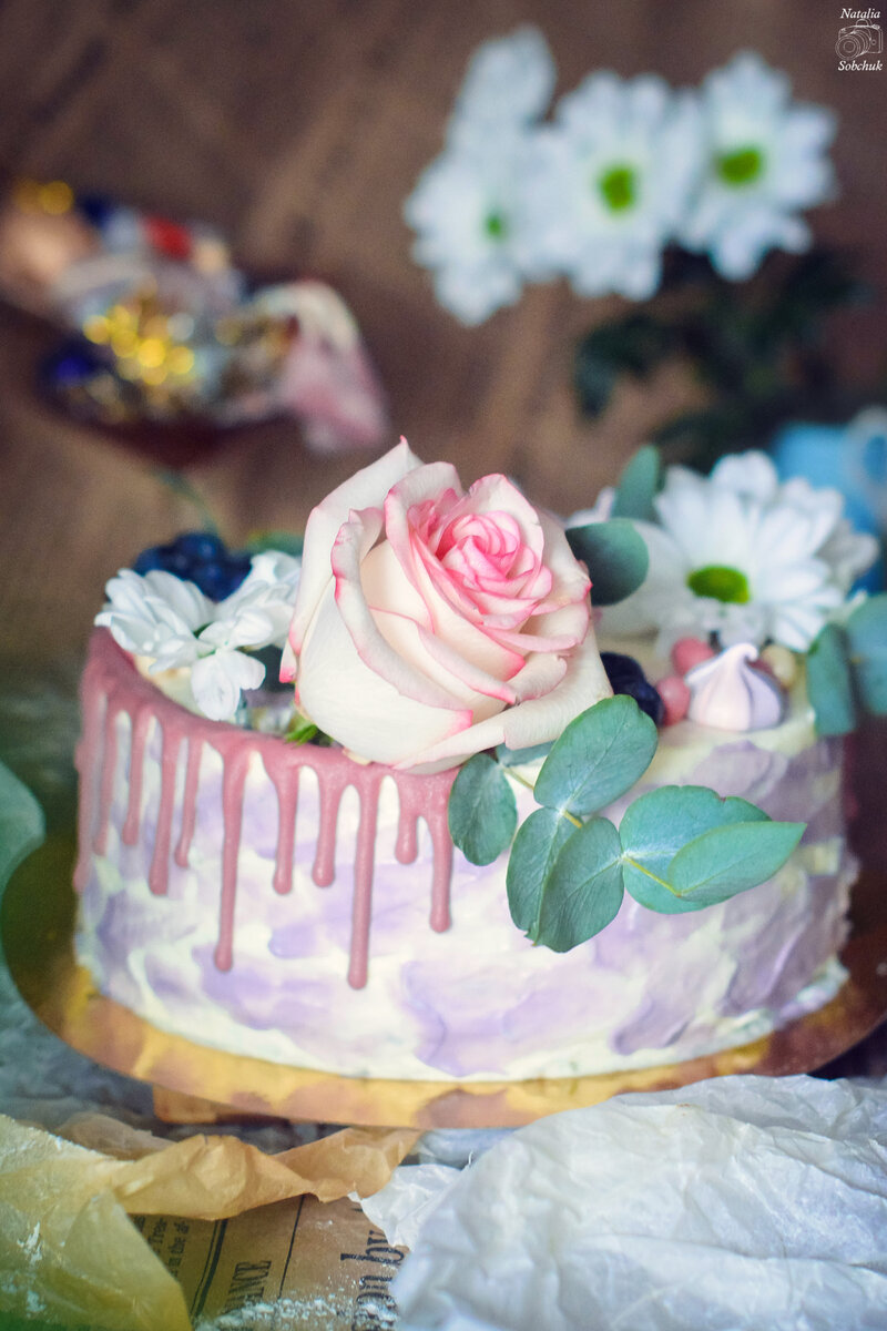 Основой для торта является пористый бисквит с удивительным лавандовым вкусом, а дополнение из нежного крема чиз и сладкого черничного конфита делает его просто невероятным. Каждый кусочек этого десерта наполняет атмосферу радости и праздника.