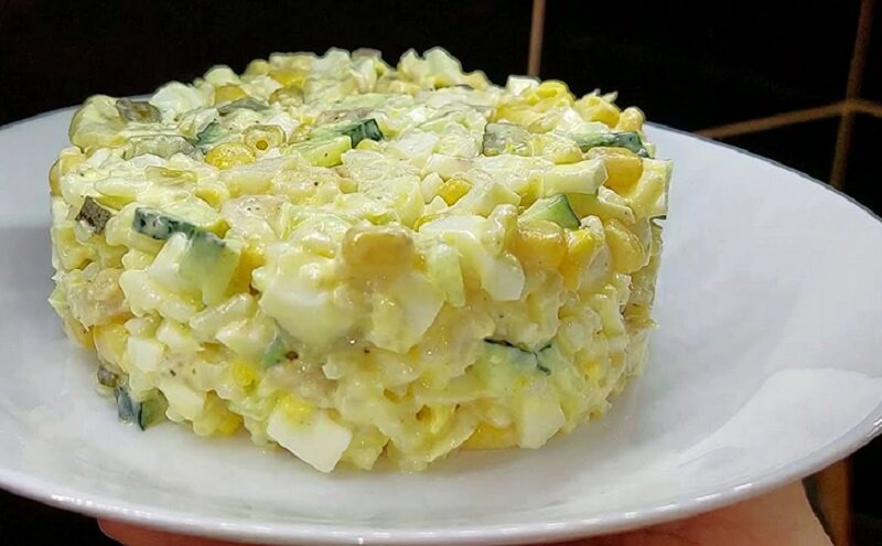 В большой миске мелко нарезать яйца, маринованный и свежий огурцы. Добавить отварной рис и консервированную кукурузу. Затем нарезать рыбу кубиками и отправить в миску. Все ингредиенты тщательно перемешиваются, заправляются майонезом, добавляется молотый перец и соль по вкусу.