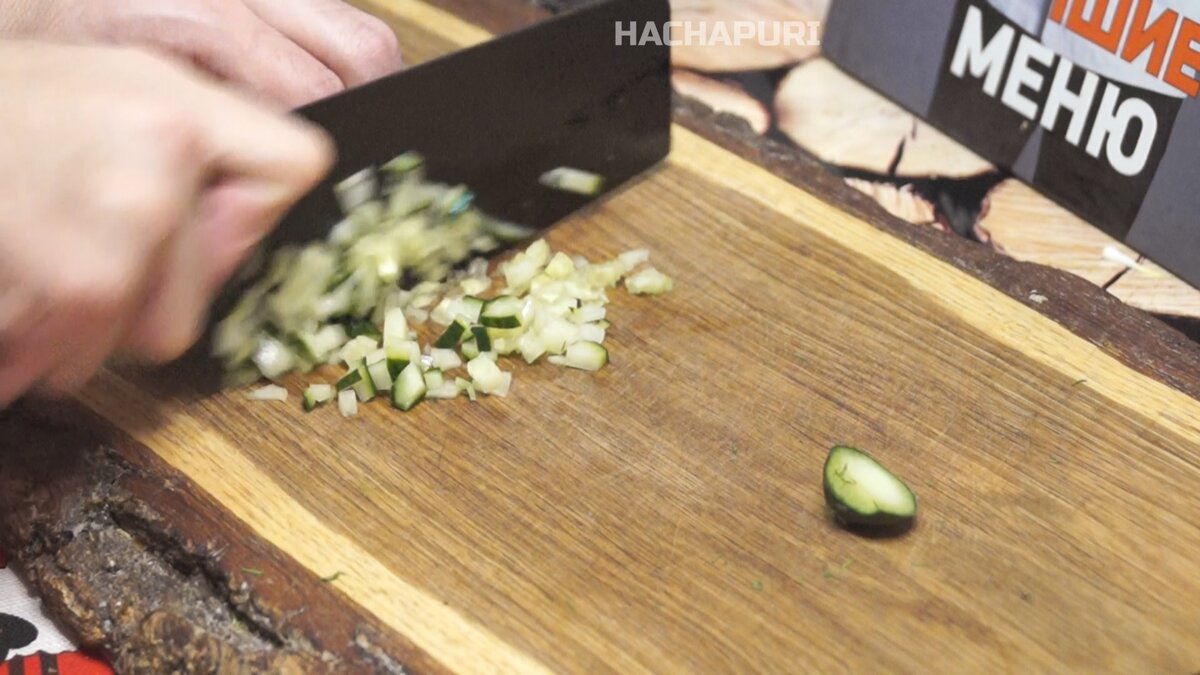 Нарезать огурец мелкими кубиками, а зелень укропа — тонкими полосками.