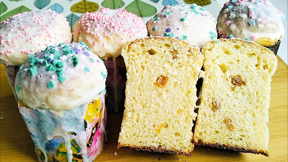 Выпекать куличи при температуре 170-180° в течение 30 минут, проверяя готовность с помощью деревянной шпажки.