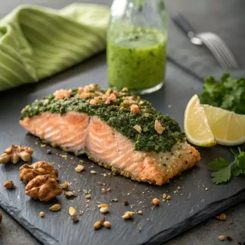 Это легкое и полезное блюдо может стать идеальным завершением вашего дня после strenuous workouts. Начните с разогрева духовки до 200°C. Филе лосося следует промыть и слегка обсушить, затем приправить солью. Приготовьте зелёную пасту, смешав шпинат, петрушку, орехи, чеснок и оливковое масло в блендере до однородной массы. Нанесите полученную смесь на рыбу, запеките в духовке 15–18 минут — и ваш ужин готов!