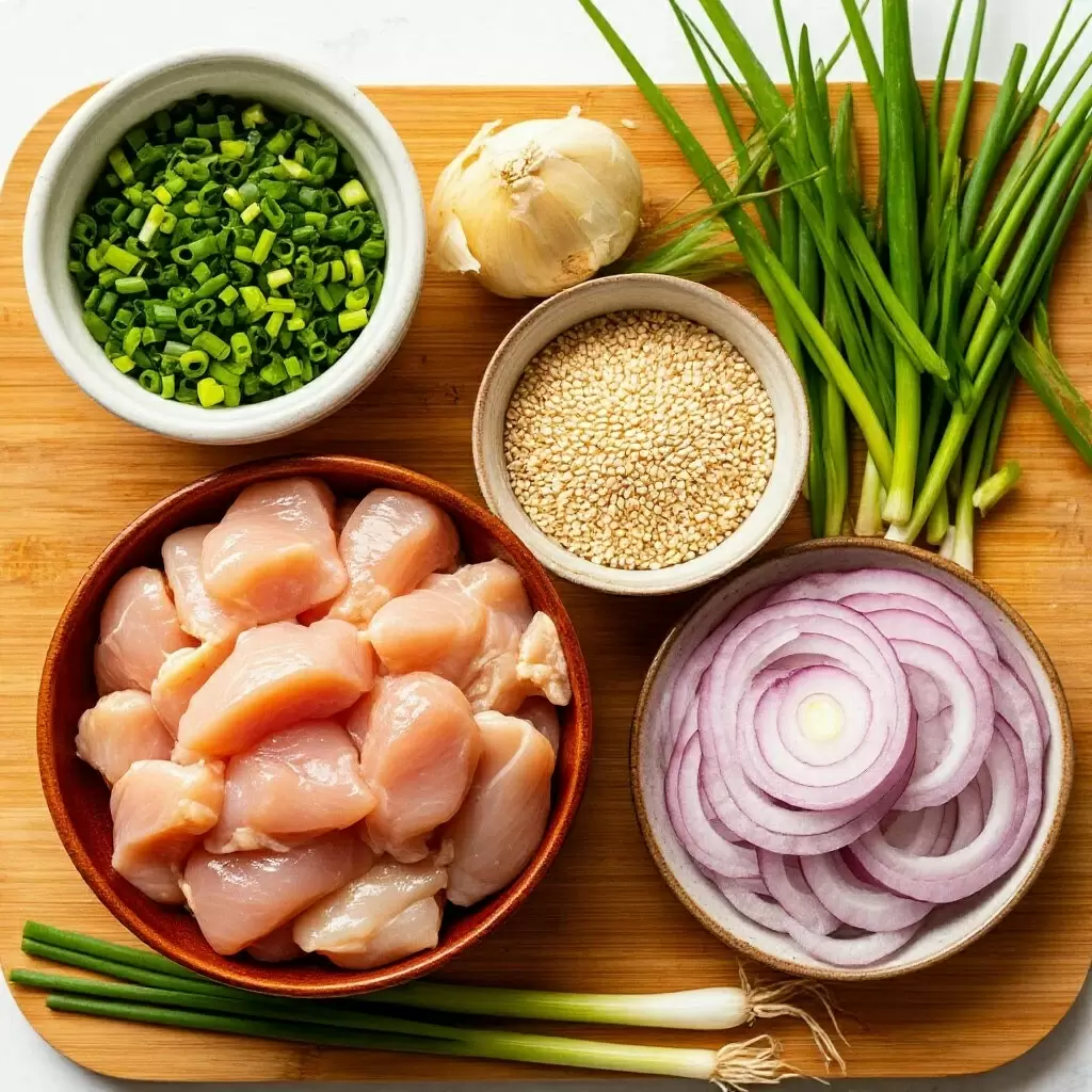 1. Подготовка ингредиентов: Курицу нарезать тонкими полосками. Морковь натереть на терке или нарезать соломкой. Лук нарезать полукольцами, чеснок мелко порубить, а зеленый лук нарезать наискосок.