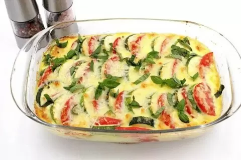 Теперь нарежьте кабачки кружочками толщиной примерно 1,5 см, а помидоры — по 0,5 см. Разогрейте духовку до 180 градусов. В форму для запекания выложите чередующимися слоями кружки кабачков и помидоров, а затем залейте все приготовленной сливочно-сырной смесью.