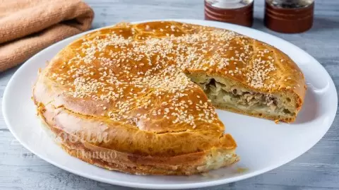 5. Закрываем пирог оставшимся тестом и, при желании, посыпаем семечками кунжута. Выпекаем в разогретой до 170 градусов духовке около 45-50 минут.