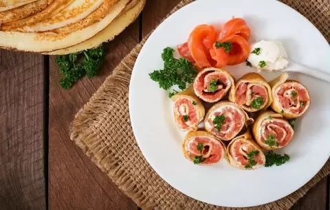 - Блинчики с семгой и сливочным сыром: Просто намажьте блин сливочным сыром, добавьте сахарину семги, укроп и сбрызните лимонным соком. Сверните и подавайте с итальянским акцентом.