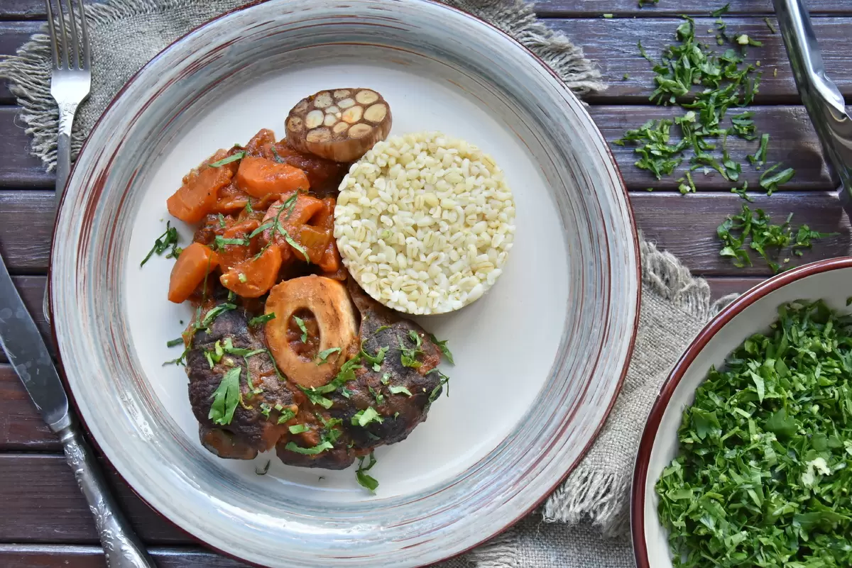 Оссобуко из телячьей голяшки — это не просто блюдо, а настоящая кулинарная классика, завоевавшая популярность среди гурманов. Запекание мяса с трубчатой костью в ароматном соусе создает незабываемый вкус, который обязательно понравится всем вашим гостям. Для окончательного штриха к этому лакомству предлагается гремолата, которая добавляет свежести и яркости.