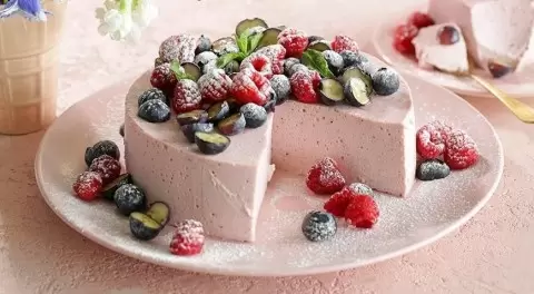 Шаг 4: После полного застывания аккуратно переложите десерт на тарелку, украсьте ягодами и мятой, а также посыпьте оставшейся сахарной пудрой для подачи.