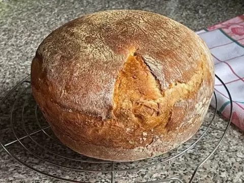 Если у хлеба уже появилась золотистая корочка, выпечку можно завершить. В противном случае, стоит продолжать выпекание при температуре 200 °C, пока не достигнется желаемый результат: румяная корочка, манящая своим хрустом.