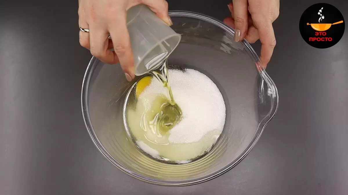 Начните с того, что в глубокой миске взбейте яйцо с маленькой щепоткой соли, добавьте ванильный сахар и обычный сахар. Влейте растительное масло и взбивайте массу с помощью миксера в течение 1.5–2 минут до однородности.
