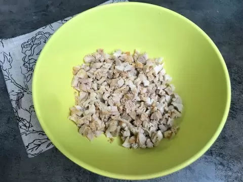 - Отделить мясо курицы от костей и кожи, нарезать на небольшие кусочки.