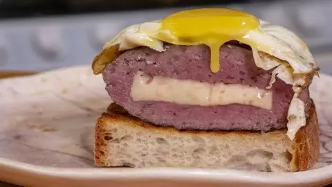 Хлеб нарезаем, намазываем небольшим количеством сливочного масла и поджариваем до появления румяной корочки. На оставшемся масле жарим два яйца. Готовые бифштексы выкладываем на поджаренный хлеб и сверху помещаем яйца. Внутри мясо остается сочным, сыр расплавленным — очень вкусно!
