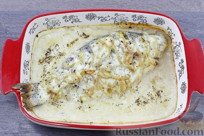 - Карась, запеченный с луком и сметаной: Это традиционное блюдо, которое порадует своих любителей. Перед запеканием рыба слегка обжаривается, а затем запекается с ароматными луком и сметанным соусом.