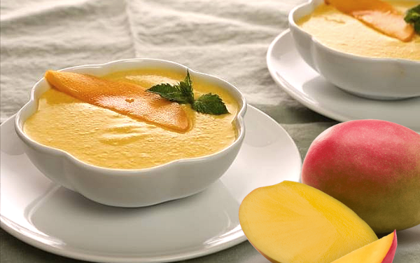 Когда крем остынет до комнатной температуры, к нему добавляют йогурт. Разложенный по порционным вазочкам десерт украшен ломтиками манго и помещается в холодильник на несколько часов для загустения.