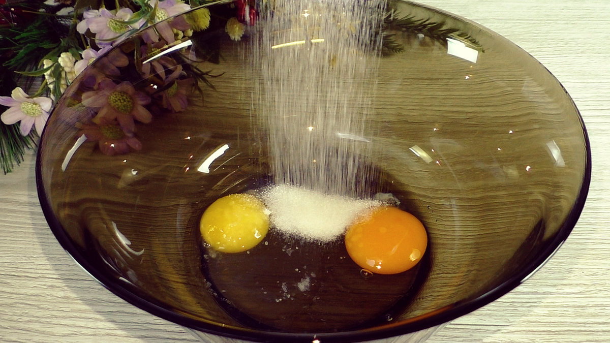 Для начала соедините яйца, щепотку соли и сахар. Количество сахара можно варьировать от 100 до 130 г в зависимости от того, какой вкус вы хотите получить. Если вы добавляете кислые ягоды, 130 г будет оптимально. Важно помнить, что при отсутствии начинки лучше сократить количество сахара до 100 г.
