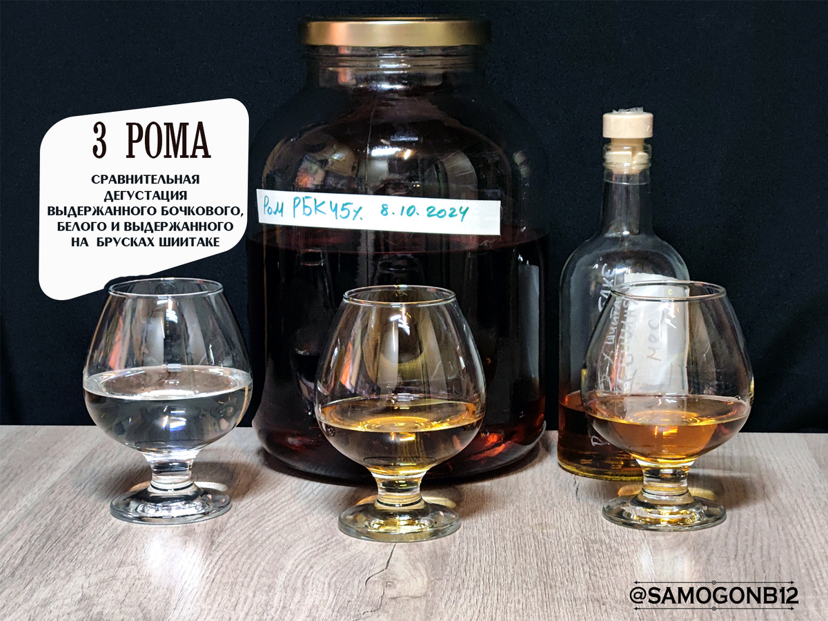 Работа началась летом, когда было решено изготовить ромовую брагу из тростникового сахара-сырца. В октябре брага была перегнана, и результат был тщательно распределен. Часть рома была отобрана для хранения в малой бочке, другая часть — в стеклянной банке, где добавили дубовые и вишневые бруски, обработанные грибами шиитаке. Этот эксперимент был проведен с целью изучения влияния различных методов выдержки на вкус и аромат готового напитка.