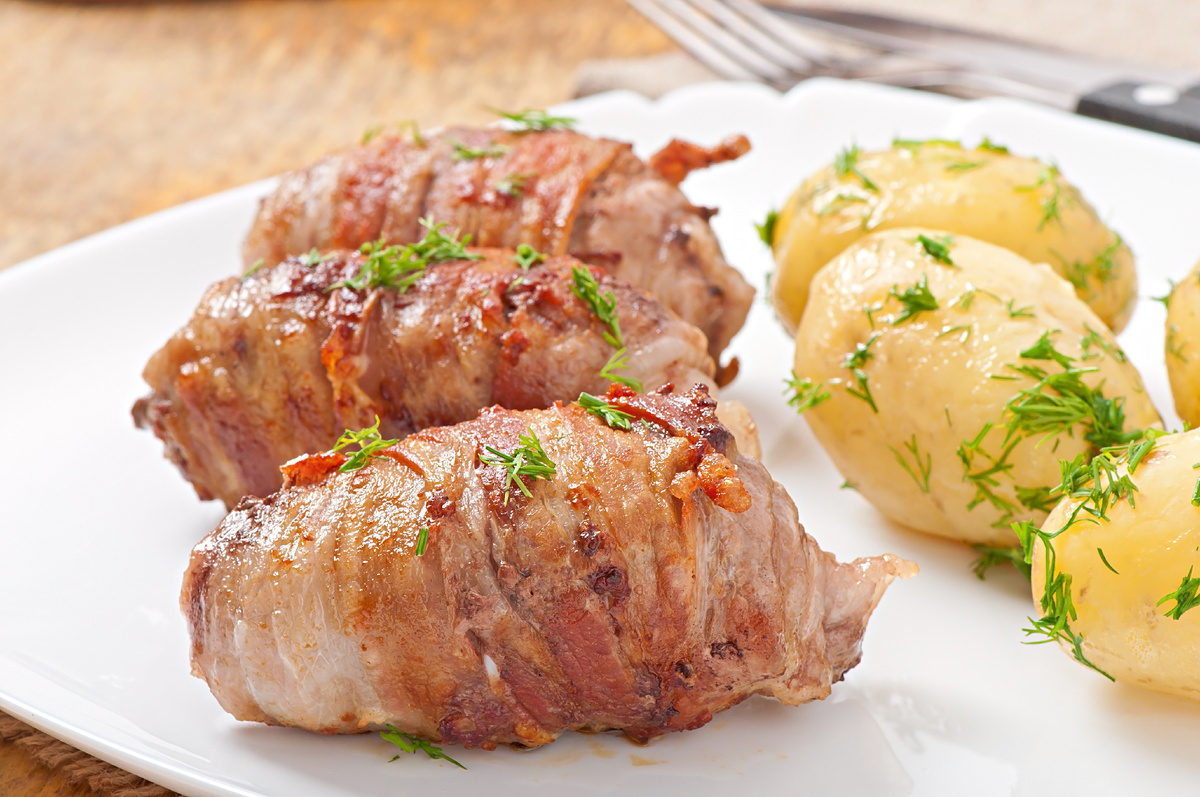 Основной секрет: мясо нарезается толстенькими ломтиками, оставаясь при этом сочным благодаря лукам, лежащим под свининой, которые придадут нежности.