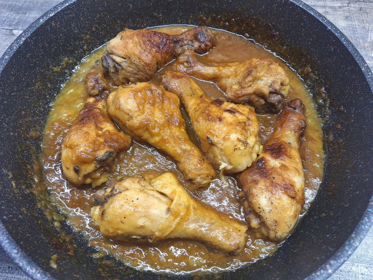 После того как лук приобрел характерный карамельный оттенок, в сковороду возвращаются куриные голени. Не забудьте их запорошить специями и солью, накрываем крышкой и тушим на среднем огне еще 15 минут. Затем голени следует перевернуть, добавить немного воды, если соус начинает подгорать, и продолжить готовку еще 13–14 минут под крышкой.