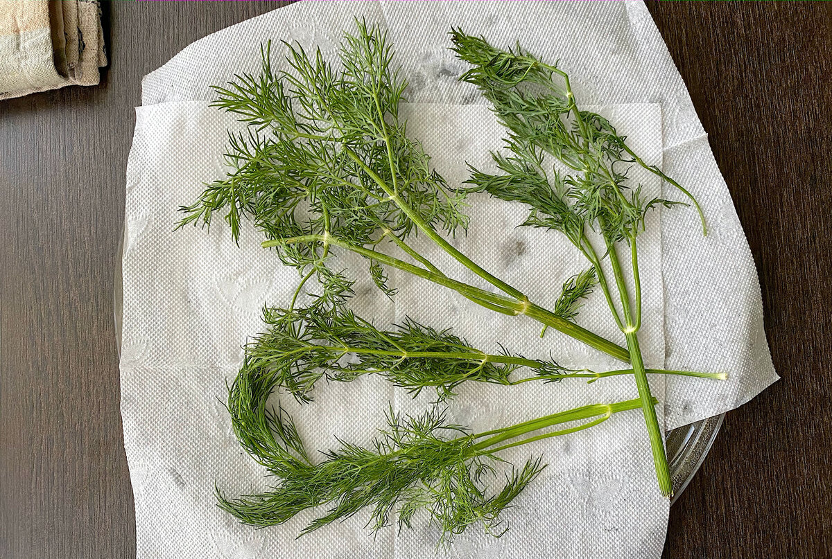 - На блюдо для микроволновки выложите подготовленный укроп, предварительно застелив его бумажными салфетками;