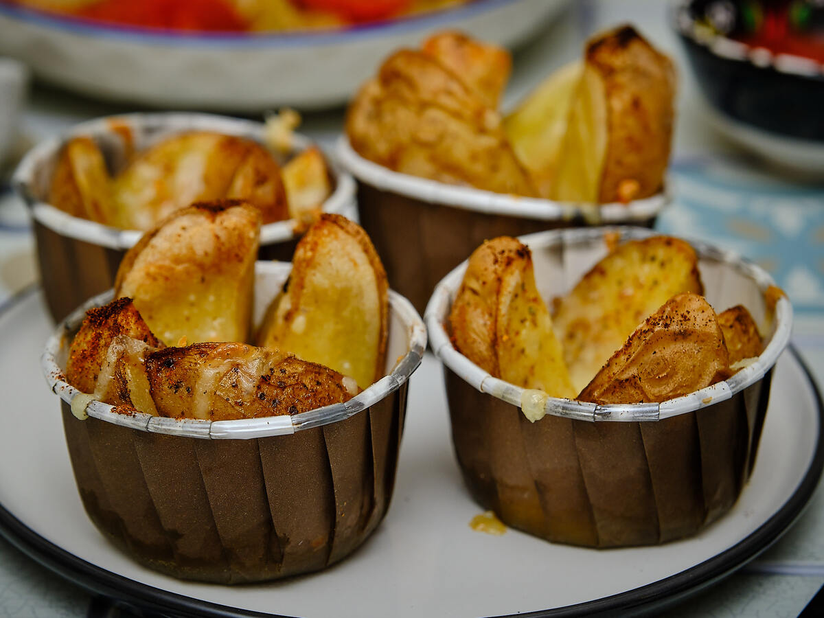 Сначала картофель средних размеров нужно тщательно вымыть и нарезать на дольки. На этом этапе можно сделать заправку, смешав чеснок, растительное масло и любимые специи, такие как соль, перец, паприка и травы. Картофельные дольки следует хорошо обвалять в этом "маринаде".Теперь выложите в каждую формочку по 4-5 дольек картофеля, чтобы заполнить их примерно одной картофелиной.Отправьте формочки в духовку и запекайте до появления золотистой корочки.Пока картофель запекается, натрите сыр на терке. Когда картофель уже почти готов, посыпьте его натёртым сыром и оставьте в духовке на 5-7 минут, чтобы сыр расплавился.Запечённые дольки можно подавать в формочках вместе с мясом или рыбой, а также использовать как самостоятельное блюдо, дополненное различными соусами.Приятного аппетита!