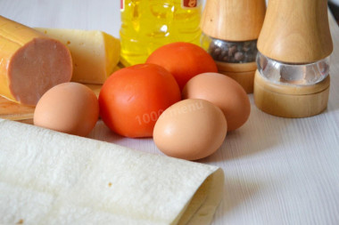 Для начала стоит подготовить все необходимые составляющие: тонкий лаваш, колбасу, сыр, помидоры и яйца. Процесс очень динамичный и увлекательный!