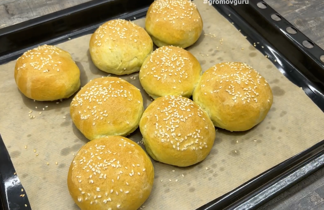 Когда тесто увеличится в объеме, его обминают, чтобы убрать лишний воздух, и делят на равные части. Формируют круглые булочки и выкладывают на противень, застеленный пергаментом. При желании верхушку можно посыпать кунжутом. Накрывают и оставляют на 20 минут для финальной расстойки.