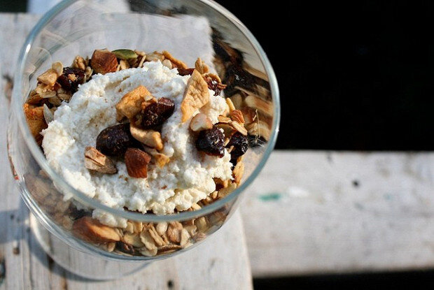 Подавайте гранолу с кремом: можно уложить гранолу в тарелку и щедро полить сверху кремом или добавить его в виде шарика.