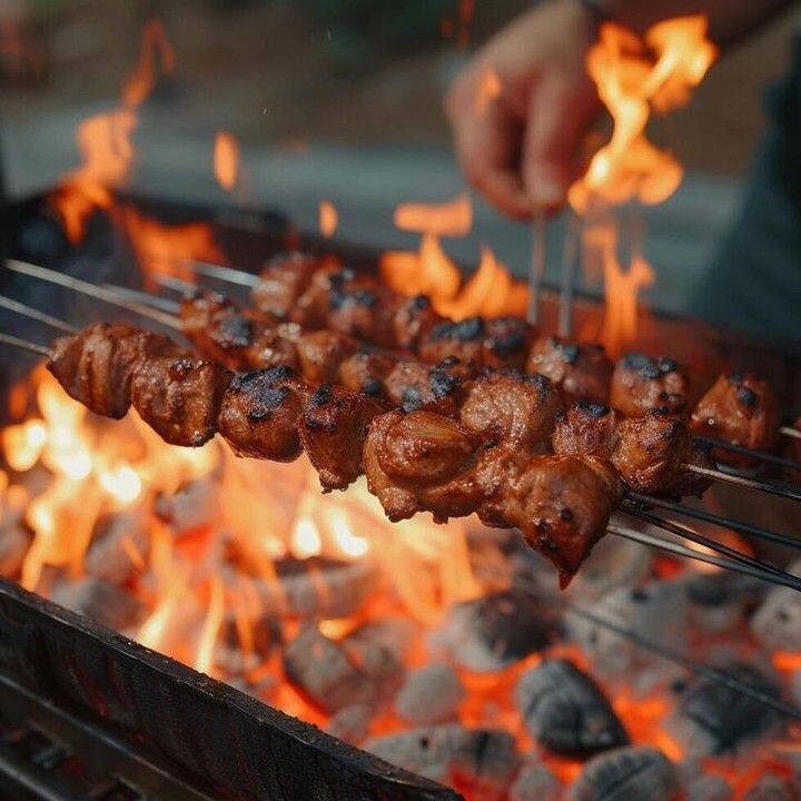 - Жарка: Угли должны быть горячими, но без открытого пламени. Шашлык готовят, поворачивая шампуры, что обеспечивает равномерную прожарку.