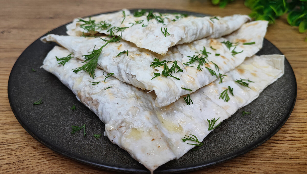2. Тонкий лаваш разрезать и подготовить воду в отдельной тарелке. Окунуть одну половинку лаваша в воду и нафаршировать мясной смесью. Накрыть второй половиной лаваша и зафиксировать края, смочив их водой.