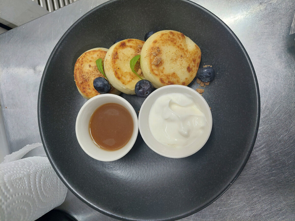 Когда, наконец, официант принёс приборы вместе с супом, окажись всё уже остывшим, однако группа всё же смогла насладиться горячими закусками, а уже после перейти к десерту. Тут произошло самое неприятное: сырники, щедро украшенные ягодами и медом, оказались замаскированными под грязненькие майонезные капли. Это не могло не разочаровать.