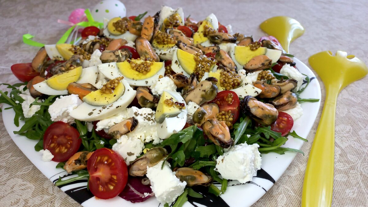 Сыр фета нарезается кубиками, а куриные яйца, предварительно сваренные вкрутую, очищаются и нарезаются на дольки. Для разнообразия подойдут и перепелиные яйца. Мидии следует освободить от рассола или масла, как вам больше нравится.