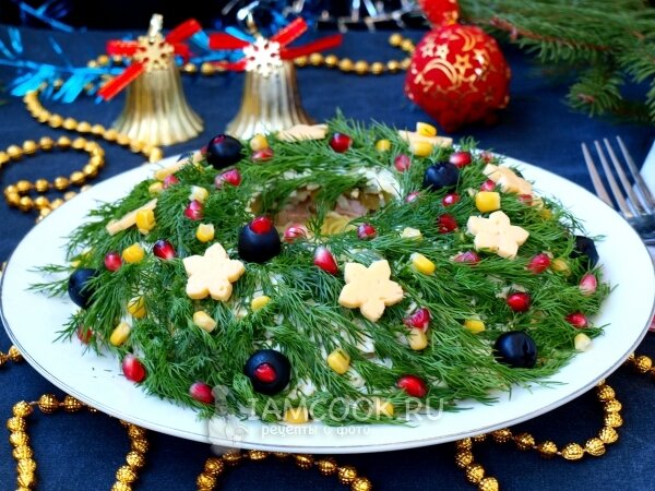 Для придания блюду праздничного вида можно использовать зерна граната, кукурузу или маслины. Также можно вырезать из твердого сыра симпатичные фигурки в виде звездочек и других новогодних символов. Чтобы вкусы максимально раскрылись, стоит оставить салат настояться несколько часов.