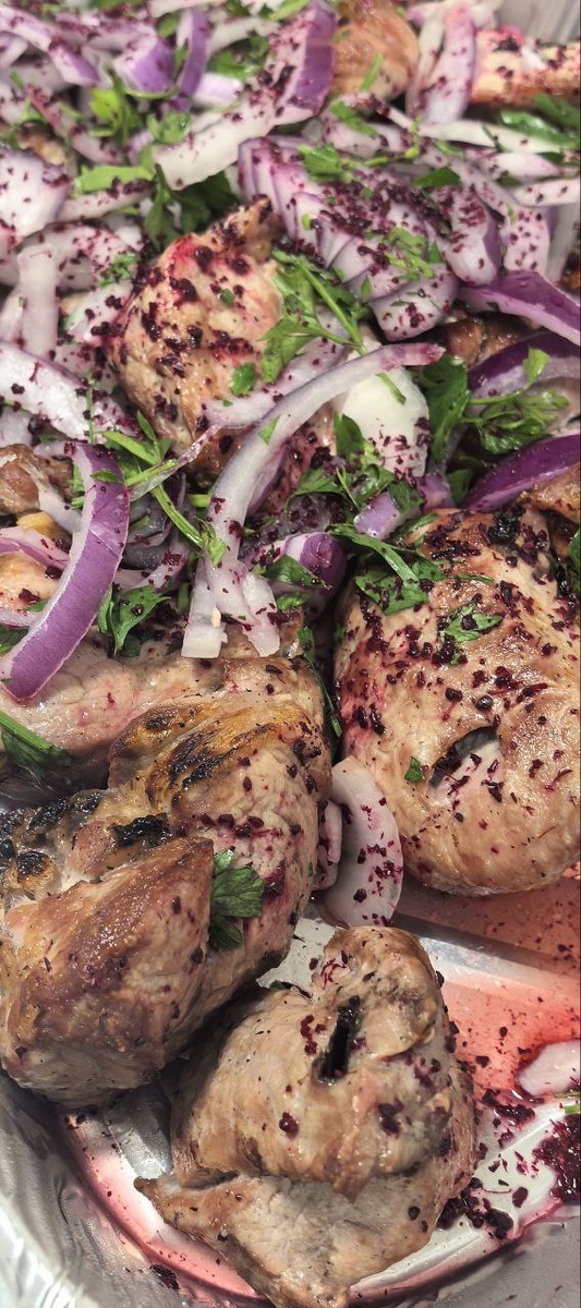 Затем следует важный акцент — маринованный лук с сумахом. Красный лук нарезается тонкими полукольцами, мнётся с солью и щедро посыпается сумахом. Эта пряность добавляет не только вкус, но и яркий цвет, дополняя нашу осеннюю палитру. В итоге получается настоящий кулинарный шедевр, который передаёт атмосферу осени в каждой порции.