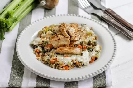 - Очистите морковь, лук-порей разделите вдоль и тщательно промойте. Все овощи нарежьте кубиками. Используя ту же сковороду, обжарьте их на растительном масле 3-4 минуты, приправив слегка солью. Затем добавьте к ним отваренную полбу. Посыпьте натертым сыром и накройте крышкой. Уменьшите огонь и готовьте, пока сыр не расплавится. Подавайте в горячем виде вместе с индейкой.