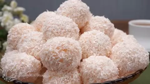Когда крем достаточно остынет, можно приступить к формированию десерта: из охлажденной массы скатать шарики размером с грецкий орех. Чтобы облегчить этот процесс, рекомендуется смачивать руки холодной водой. Затем каждый шарик обвалять в кокосовой стружке и аккуратно выложить на блюдо.