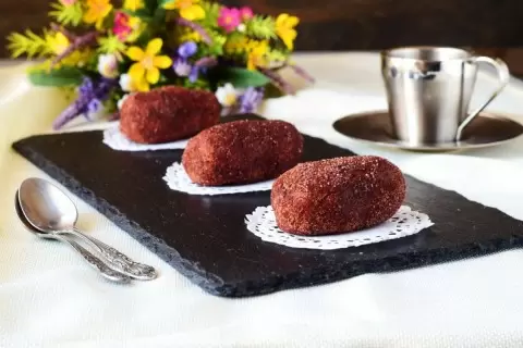 Сформировать из теста пирожные похожие на картошку. В отдельной миске приготовить обсыпку из сахара и какао, а затем обвалять каждое пирожное.