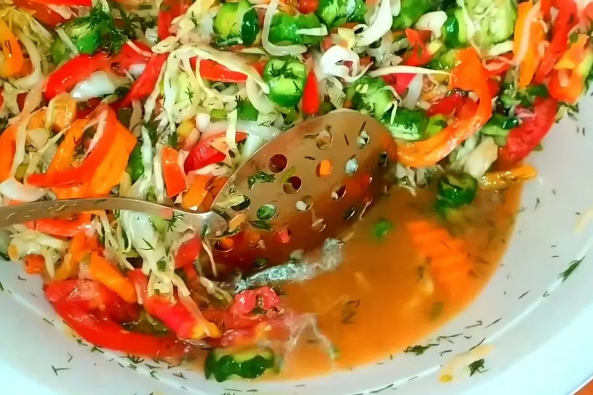 Для начала все овощи следует нарезать: капусту тонко нашинковать, огурцы порезать полукружками, болгарский перец — соломкой, а помидоры — небольшими дольками. Морковь лучше всего натереть на крупной терке. Все нарезанные овощи помещают в глубокую кастрюлю.