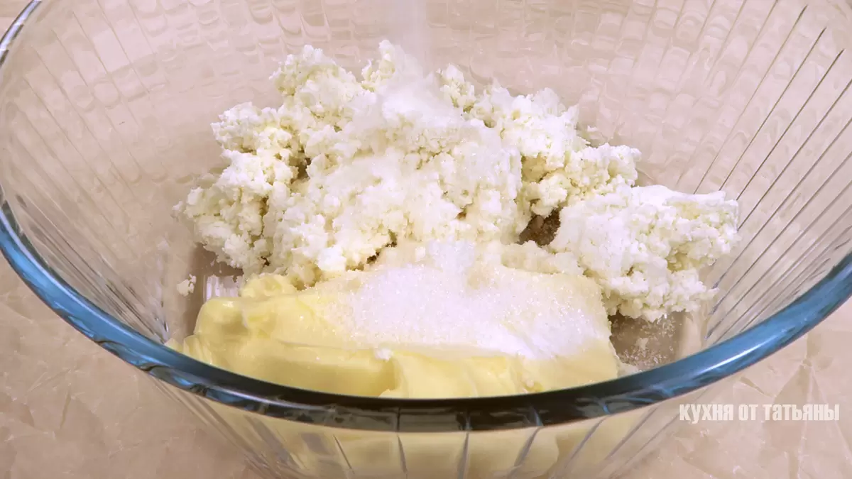 Для начала важно отметить, что все ингредиенты должны быть комнатной температуры. В глубокой миске соединяются творог, соль, ванильный сахар, масло и всего одна ложка сахара. Если творог имеет крупные зерна, его лучше перетереть через сито для достижения однородной массы.
