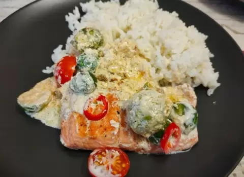 Приготовление лосося никогда не было таким увлекательным! Это замечательное блюдо объединяет нежность рыбы, яркий микс овощей и сливочный соус, что делает его идеальным для быстрого ужина.