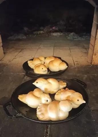 Оно разделяется на шарики по 50-60 г, накрывается полотенцем и оставляется подниматься на 10-20 минут. Из каждого шарика формируют жгут длиной 10-15 см, закручивают в узел. Хвост и голова с клювом формируются из концов жгута, а для глаз удобно использовать перчик, гречку или изюм. Перед запеканием жаворонки должны еще немного подойти на противне.