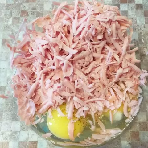 1. В миске взбейте яйца и натрите колбасу на терке. Перемешайте, не старайтесь сильно взбивать.
