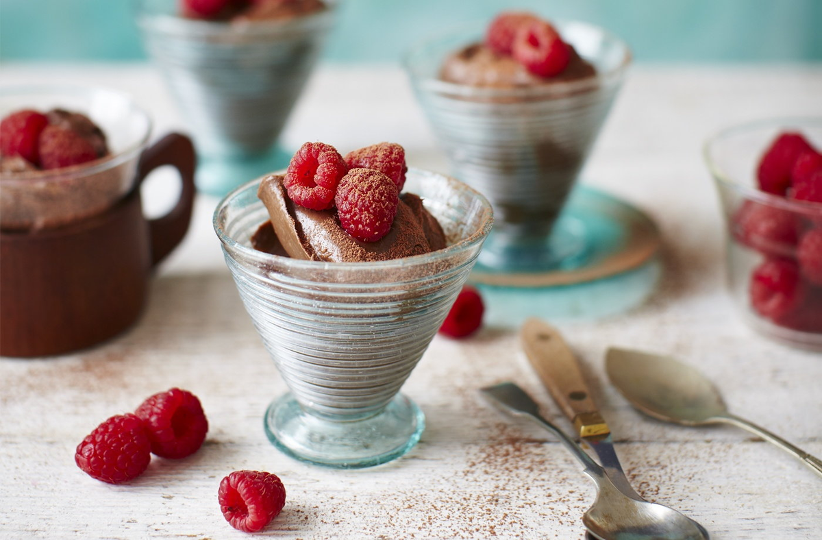 4. Переложите мусс по сервировочным стаканчикам и оставьте в холодильнике на минимум час для охлаждения. Перед подачей украсьте десерт свежей малиной.