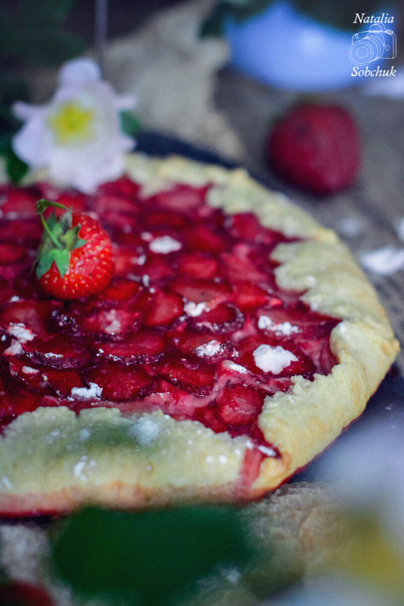 По истечении времени, каждую часть теста раскатать между двумя листами пергамента до тонкой круглой лепешки диаметром 19-25 см. В центр каждой галеты выложить половину приготовленной творожной начинки. Клубнику промыть, обсушить и нарезать ломтиками, затем равномерно распределить по начинке. Перед тем как завернуть края, посыпьте клубнику сахаром и крахмалом — это поможет избежать размягчения теста во время выпекания.