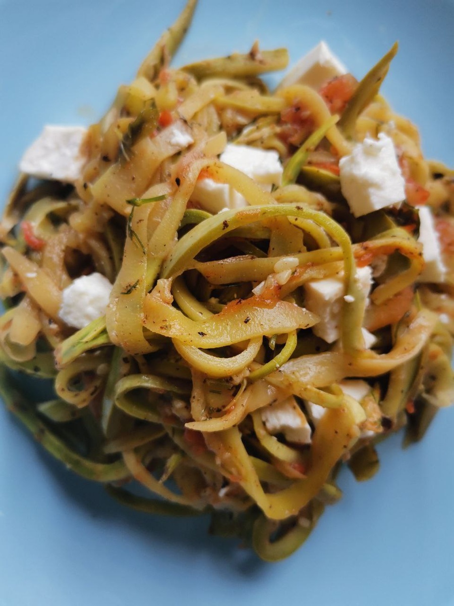 Сначала на сковороде обжаривается чеснок до золотистой корочки, после чего его следует удалить. Далее добавляется измельченный в блендере помидор или смесь томатной пасты с водой. Эту массу нужно немного потушить. В это время кабачок очищается и нарезается на «лапшу» при помощи овощечистки. Готовые ломтики кабачка добавляют в сковороду с томатной основой, присыпают зеленью и тушат под крышкой 5–7 минут. Перед подачей можно дополнить блюдо фасолью или разбить яйцо. Также прекрасно подойдут тертый сыр или щедрые кусочки феты, которые привнесут особый вкус.